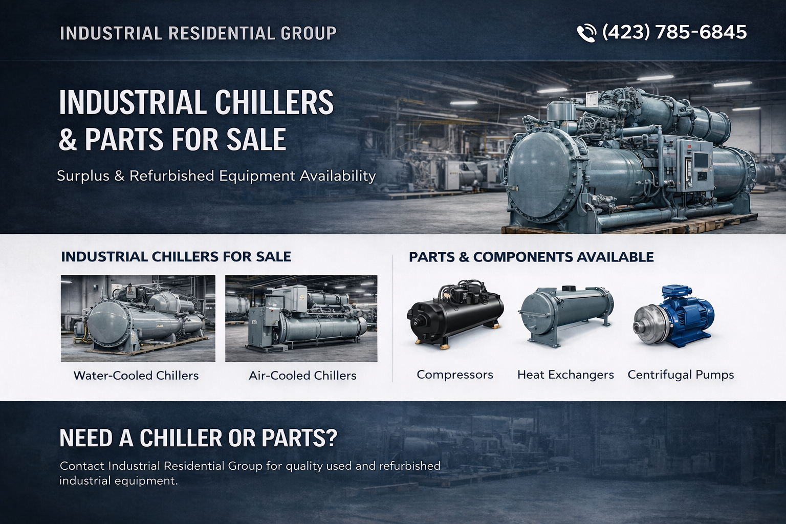 We sell a wide variety of industrial machinery like chillers, boilers, water heaters, etc. Not all of our current inventory is listed below. Please feel free to call us at (423) 785-6845 for additional parts.